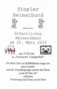 Stopler Heimatobend Der Stopler Heimatbund lädt am 25. März um 19.30 Uhr zum öffentlichen Heimatobend in Niemeyers Landgasthof ein.