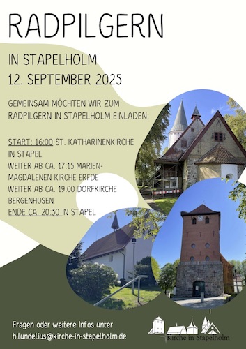 Am Freitag, den 12.09.2025, starten wir um 16:00 Uhr an der St. Katharinenkirche in Stapel und machen uns auf in Richtung Marien-Magdalenenkirche in Erfde. Dort werden wir um ca. 17:15 Uhr weiterfahren in Richtung der Dorfkirche in Bergenhusen. Und zur letzten Etappe nach Stapel werden wir um ca. 19:00 Uhr aufbrechen.